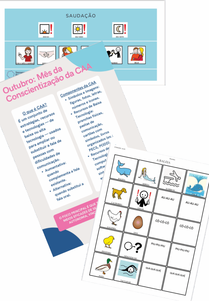 - Recursos de Baixa Tecnologia: pranchas físicas, pastas de comunicação, cartões com símbolos, livros organizados (ex.: PECS, PODD).